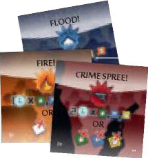 One tile in each Generation deck is different from all others, depicting one of three Disasters: Flood in the 1st Generation, Fire in the 2nd Generation, and Crime Spree in the 3rd Generation.