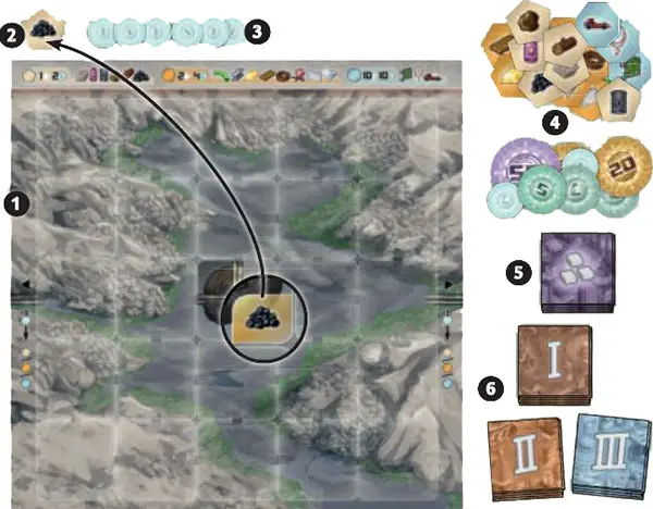 Whenever you add a tile producing one or more Goods that your City does not produce yet, take the corresponding Good tokens from the general supply and place them above your City board, in view of all players.