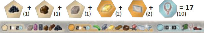 Goods: As shown at the top of your City board, each Raw Good is worth 1 VP, each Processed Good 2 VP, and each Luxury Good 10 VP. Each Good is scored only once, regardless of how many tiles in your City show that Good. (In other words, only score the Good tokens above your City board).