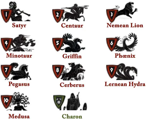 The Creature cards present the illustration of a creature stemming from the Greek mythology on a red background, and a number from 1 to 10. Every number is associated to a creature, and there are 4 of each.