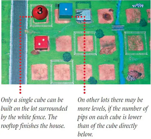 Floor cubes are placed on the square lots, starting from the street. They are placed pip side up. A floor cube can also be placed on another cube already placed if the cube below has a higher number of pips.