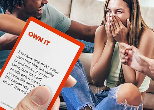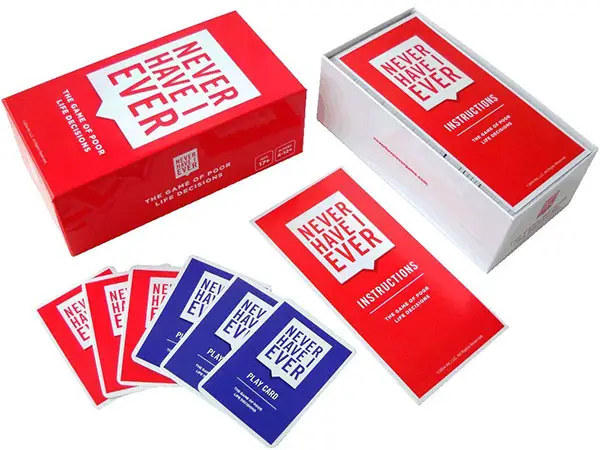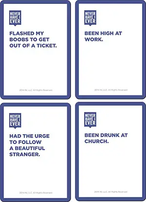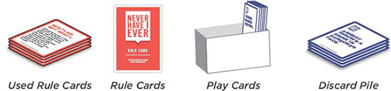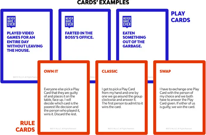 Every game of Never Have I Ever presents a chance to relive life's funny, embarrassing and awkward moments with your friends. The Play Cards are examples of poor life decisions, and the Rule Cards tell you what to do.