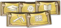 Receive 5 VPs for every 3 different Volumes that you have on the Action cards available to you at the end of the game (both on those in your hand and on those which you played on your desk in the final round, but not those placed under your desk) and on your Master cards. The maximum number of VPs you can receive is 15, even if you have more than 3 sets of 3 different Volumes. You cannot use Potion tokens to replace Volumes required by this Objective.