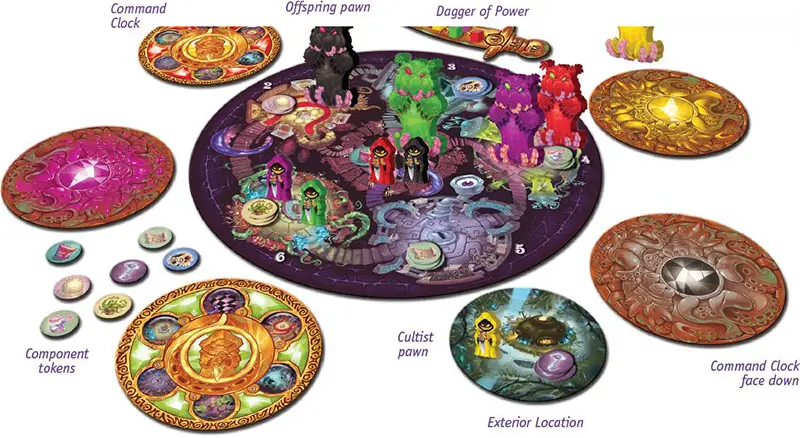 Place all the Cultist pawns on the library, the central Location on the gameboard. Each player keeps his Offspring pawn nearby.