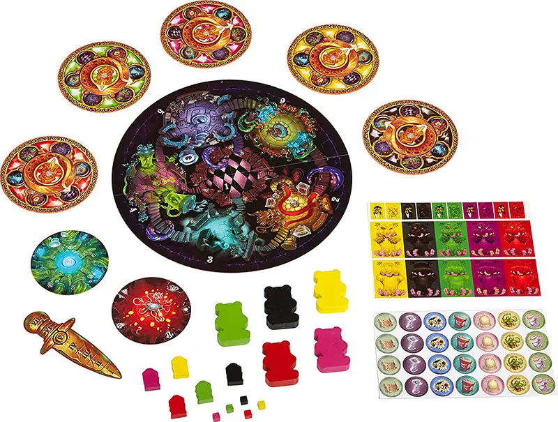 Place the Dagger of Power near the gameboard. Each player chooses a cult color and gathers his cult's material (2 pawns, 1 marker, 1 Clock).
