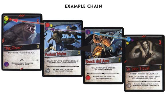 Order cards are played from players' hands to form a chain. A chain is one or more cards played in a sequence.