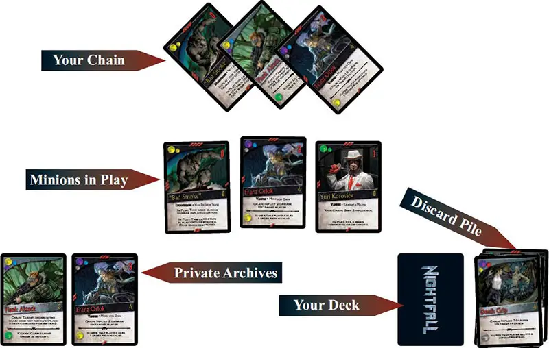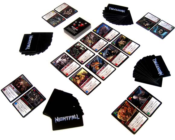 Each player shuffles his starting deck and draws five cards to form his hand. Determine a first player by any mutually agreeable method. You are now ready for Nightfall!