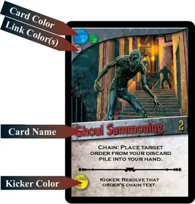 Your deck is composed of order cards. There are two varieties of orders: minions and actions. All order cards have a color, which is indicated by the moon icon in the top left corner of the card. Beneath the card's color icon are one or two smaller moons. These icons indicate the link colors for that card. See Chaining Cards on page 13 for an explanation of how link colors are used.