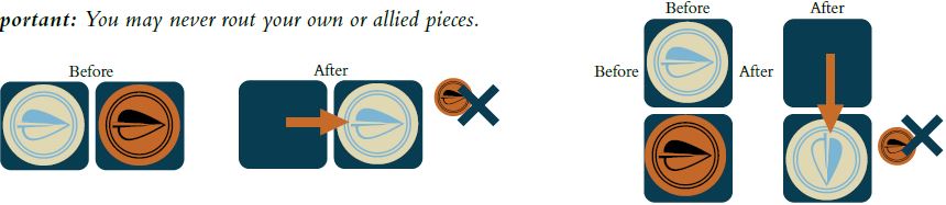 A piece may move into a space occupied by an enemy piece that is not facing it. This routs the enemy piece. Note that routs always happen as the result of a move action. Routed pieces are removed from the board and placed into their city's routed pieces area. They may be rallied later.