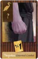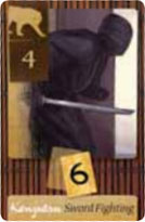Place a shuriken to visit the sensei to learn one skill. Select a skill by discarding the dojo card shown on the skill tile. A ? means that you may discard any dojo card. You may learn skills from different styles. Once you learn a skill of a certain style (snake, tiger, crane), you do not have to discard a dojo card to buy more skills of that style.