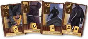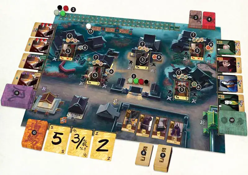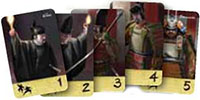 This sets the turn order for the first round. The other two markers from each player are placed at the beginning of the Honor Track 2. Players keep their 3 shuriken in front of them.