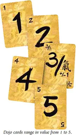 Shuffle the Dojo Cards and deal 4 to each player. Turn up 3 dojo cards on the dojo and place the deck next to the Dojo 12 face down.