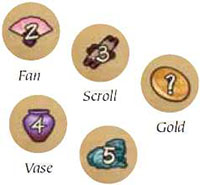 Gold may be substituted as any treasure you choose, scoring as that treasure. In the previous example, you could bribe the envoy with 1 fan, 2 vases, and 1 gold-the gold would have to substitute for a vase. This would score 14 honor.