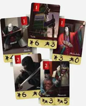 Place a shuriken next to the palace to bribe one envoy by discarding the matching treasures and immediately scoring the value of those treasures in honor. Take the envoy and place it face up in front of you.