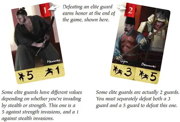 More than one alarm guard may be drawn in a house, so an unlucky ninja may face several elite guard cards in one invasion.