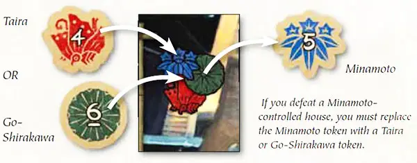 Take a 2 and a 4 honor value Taira (red) clan token and place them on different Clan Houses. Do the same for the Minamoto (blue) clan. Place the 6 honor value Go- Shirakawa (green) token 6. Place the remaining clan tokens in a pile off to the side of the board. Mix up the Treasure tokens in the bag and place 3 treasures in each house 7, plain side up (red side face down).