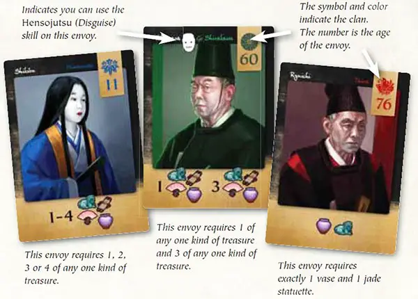 When specific treasures are shown on an envoy, those treasures are required. For example, if an Envoy card shows a fan and a jade, you must discard a fan and a jade, immediately scoring 7 honor.