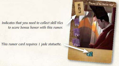 Place a shuriken near the pavilion to spread one favorable rumor among the nobility. You discard 1 or 2 treasure indicated on the rumor and take the rumor card. As with Envoys, you immediately earn honor from the treasure you spend. Some rumor cards may be bought with any treasure, some require specific treasure.