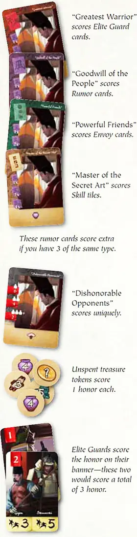During each scoring phase, the players with the most and second most envoys in each clan earn additional honor or a Rumor card. In case of a tie, the player with the oldest envoy in that clan wins.