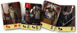 Here's a typical house controlled by the Taira clan. There is a 5 value Samurai turned up as the sentry guard, protecting the scroll (the lowest value plain treasure). There is an unknown guard protecting each of the other treasures-a vase and a gold.