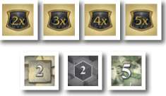 - 24 Reward tiles (with a bonus on the front and a 2x - 5x VP Multiplier on the back)