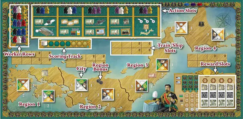 Place each of them on an empty Train/Ship slot on the Game Board. There are 8 Train/Ship slots in each Region. If more than 1 Train tile is placed with the same action, they must be placed in different Regions.