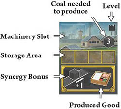 Take an additional number of cubes from the common supply, according to any Machinery tile on the Factory (+1 or +2), and place them in that Factory's Storage area, if possible.
