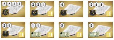 8 Contract tiles (There are 8 different Contracts. The player takes 1 of each kind and places them face up in front of himself).
