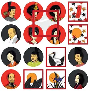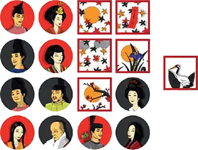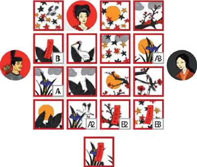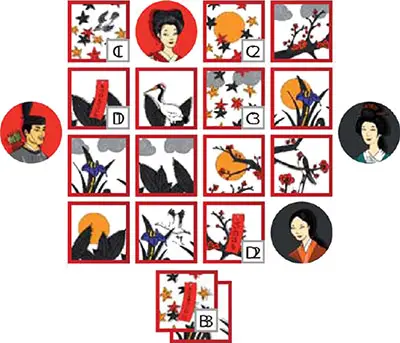 The Heike player chose to remove the garden tile containing the maple leaves and poem flag (B3). now, the Genji player must choose from one of the remaining tiles that either has the maple leaves (Cl, C2, C3) or the poem flag (DI, D2) as one of its elements.