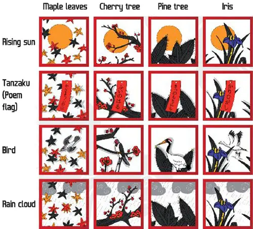 Each garden tile is composed of 2 elements, one plant (maple leaves, Cherry tree, Pine tree, Iris) and one poetic symbol (Rising sun, Poem flag, Bird, Rain cloud).
