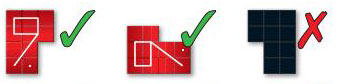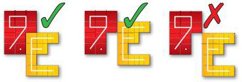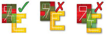A tile on level 1 or higher must overlap two or more tiles on the level directly beneath it. No part of the tile can overhang without a tile directly beneath it.