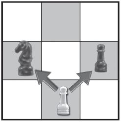 Unlike every other type of piece Pawns have a special way to capture an opposing piece. A Pawn captures a piece that lies one space ahead on either diagonal (never directly ahead).