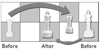Ah, the Pawn! For such a simple piece, it has yet another nuance of movement. A Pawn may capture an opposing Pawn "en passant" (in passing) in one special circumstance.