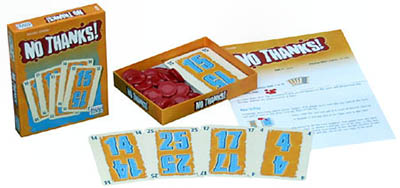 The turn to play passes clockwise, and the next player faces the same decision: Either accept the card (including the chip), or decline it and pay one of his own chips. The game goes on this way until all cards have found someone willing to accept them. The player with the fewest points wins.