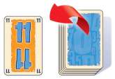 Example: Peter turns over the top card of the deck. It shows the number 11. As this card would get Peter 11 points, he declines it and puts one of his chips next to it. Sabrina also declines and adds one of her chips. Lisa, however, would rather save her chips, so she accepts the card. She puts down the 11 in front of herself face-up, and takes the two chips next to it up in hand.