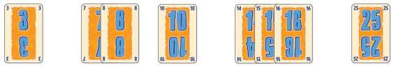 Example: At the end of the game, Lisa has three single cards and two sequences in front of her. Together, they get her 59 points (3+7+10+14+25 = 59). From that, she subtracts the 8 chips she has left, for a final score of 51 (59-8 = 51).
