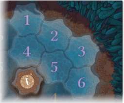 At the end of the first round, do not remove pawns from the board. Take the six set-aside pawns; you will use these pawns during the second round, while the pawns you placed during the first round will block you from using those shores.