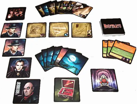 Players will form two opposing teams: the Good team (composed of vampire Hunters) and the Evil team (the Vampire Nosferatu and his accomplice Renfield). Players take the Vampire and Renfield character cards and enough Hunter cards for each remaining player. For example: 6 players = 1 Vampire + 1 Renfield + 4 Hunters.