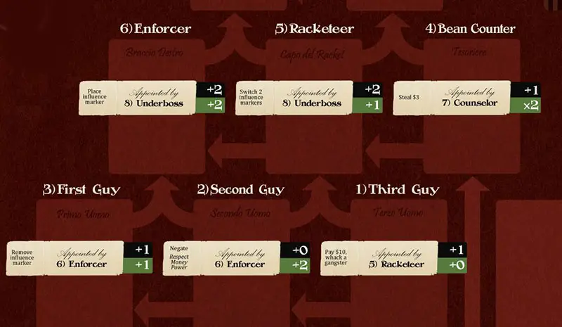 Enforcer: The player controlling the Enforcer may place one Influence marker on any Gangster on the board.