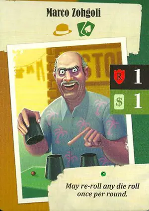 Antoine "Death" Bauza: This die maybe re-rolled (for $10 or through a special power). If/is rolled, Antoine gains no Respect. If is rolled, Antoine gains 6 Respect.
