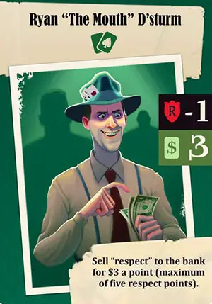 Ryan "The Mouth" D'sturm: To "sell" Respect, the controlling player moves their token down on the Respect track, receiving $3 for each space moved - for a maximum of $15.