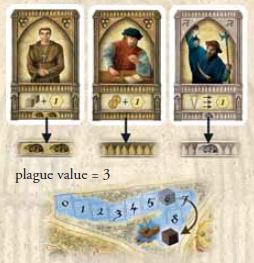 As the fifth and last phase in each round, players determine the plague value, and move the plague marker along their plague tracks accordingly. The plague value equals the sum of the rats pictured on the 3 person cards for this round.