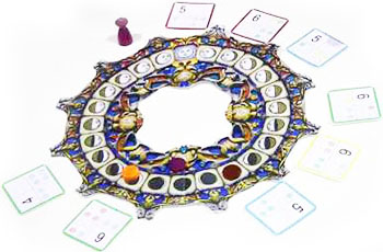 Your goal is to quickly place the 8 goal discs of the smaller stack on the tiles in your display. Once you place your eighth disc, you may refill the display. You can choose to wait to refill the display if you want to select more tiles.