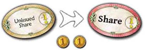 - You can take this action at most three times during the course of the game, because you only have three Unissued Shares at the start. Once a Share is issued, it remains issued until the end of the game.