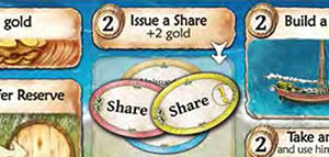 To do so, you must pay 1 gold for each Share on the Action board. In Rounds 4 and 5, the total cost is reduced by 1 gold. In Rounds 6 and 7, the total cost is reduced by 2 gold (instead of 1 gold).