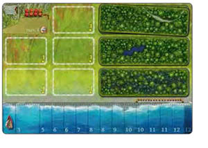 Example: Here, you build a schooner for 4 gold, placing it to the right of the preprinted catboat. This will increase your initial haul size of 3 fish to 6 fish.
