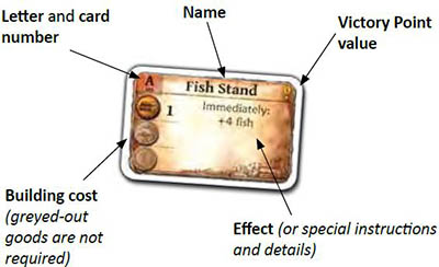 When you take this action, build exactly one Building from the display (located on or next to a supply board) or (from Round 4 on) from your hand. Pay the Building cost (wood, fish, gold) shown on the left side of the Building card and place the Building on a free Building space of your Harbor board.