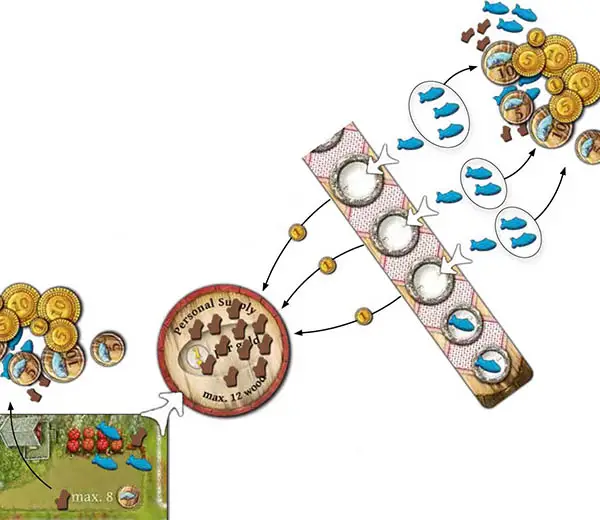 Example: There are 3 fish and 2 wood in your Reserve and 11 wood in your personal supply already. Therefore, move all the fish and 1 wood from your Reserve into your personal supply and return the remaining 1 wood to the general supply.