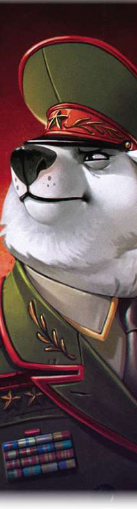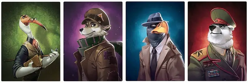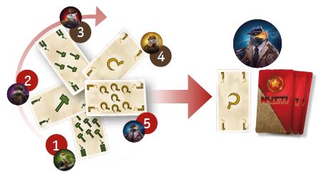 Example of a 5-player Game: In the first line, the second box is empty. So, the Wolf player chooses a team of 3 players with the Crane and Tiger players. He also chooses to give the Bonus card to either the Bear or Eagle player.