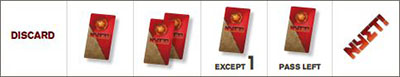 If the box with "except 1" is empty, players must discard one card, excluding cards with a value of 1. If the box with "pass left" is empty, each player must give one card to the neighbor on her left.